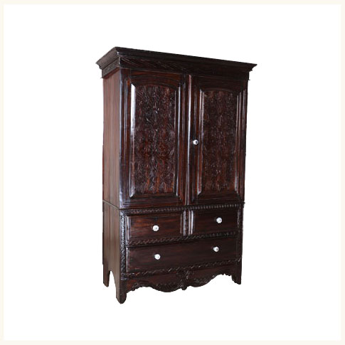 Crafted of the finest tropical rosewood, the Goa Armoire displays the bolder turnings and heavier lines that mark colonial era furniture. This stately armoire features a large cabinet, four outer drawers, and beautiful hand carving across its exterior. |